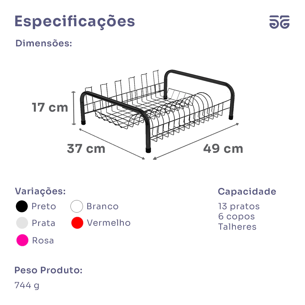 | Enferruja? | Não. O escorredor é tratado com tinta epóxi e camada anti-ferrugem — ideal para uso diário na pia |