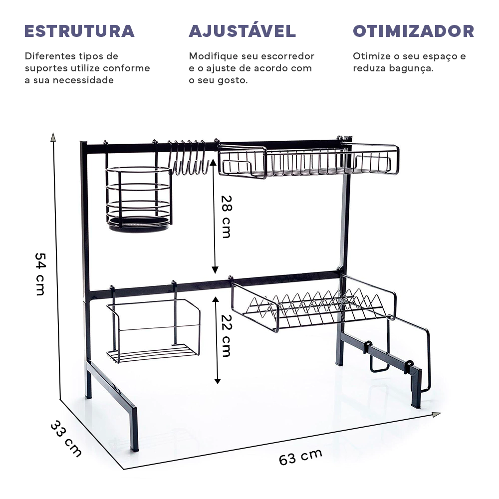 Para isso precisamos ter a informação do espaço que você tem entre sua pia e outro objeto que esteja em cima da bancada, um armário por exemplo. Meça a distância entre a pia e o próximo objeto acima ele deve ter no máximo 55cm para o escorredor entrar com um pouco de folga. A altura do escorredor é de 53cm, lembrando que, caso você coloque pratos em cima você terá que posicionar o suporte na lateral do escorredor ou embaixo. Caso tenha ficado alguma dúvida, chame a gente no chat ;)